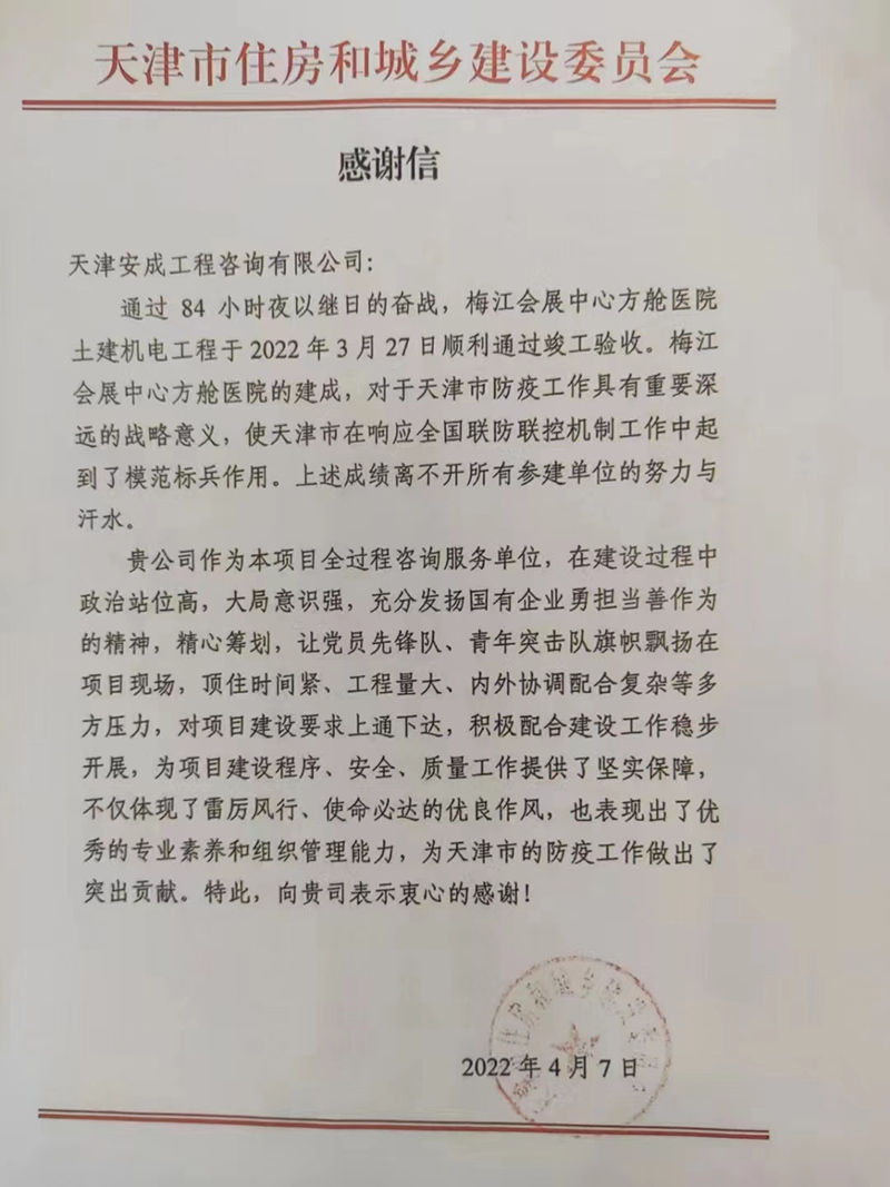 經(jīng)過(guò)84小時(shí)夜以繼日的奮戰(zhàn),梅江會(huì)展中心土建機(jī)電工程于2022年3月27日順利通過(guò)竣工驗(yàn)收。4月7日,天津市住房和城鄉(xiāng)建設(shè)委員會(huì)向安成公司發(fā)來(lái)感謝信,對(duì)安成公司在項(xiàng)目建設(shè)過(guò)程中體現(xiàn)出的雷厲風(fēng)行、使命必達(dá)的優(yōu)良作風(fēng)以及優(yōu)秀的專(zhuān)業(yè)素養(yǎng)和組織管理能力給予了高度認(rèn)可。
