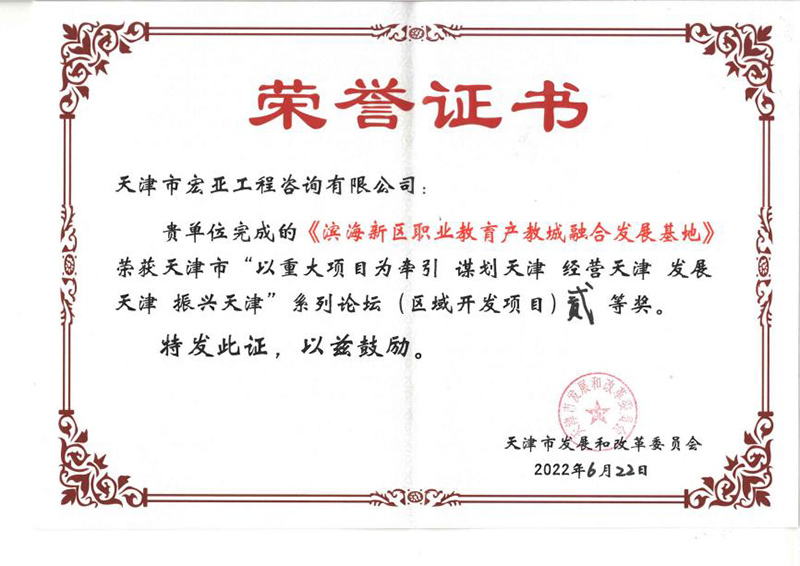 基地》項(xiàng)目榮獲天津市發(fā)展和改革委員會頒發(fā)的天津市“以重大項(xiàng)目為牽引 謀劃天津 經(jīng)營天津 發(fā)展天津 振興天津”系列論壇(區(qū)域開發(fā)項(xiàng)目)貳等獎。